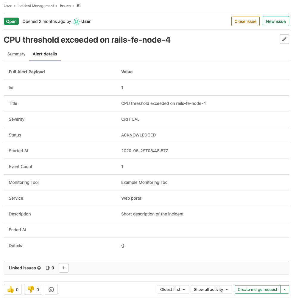 The summary section for incidents provides both critical details about and the contents of the issue template (if one was used). The highlighted bar at the top of the incident displays from left to right:
