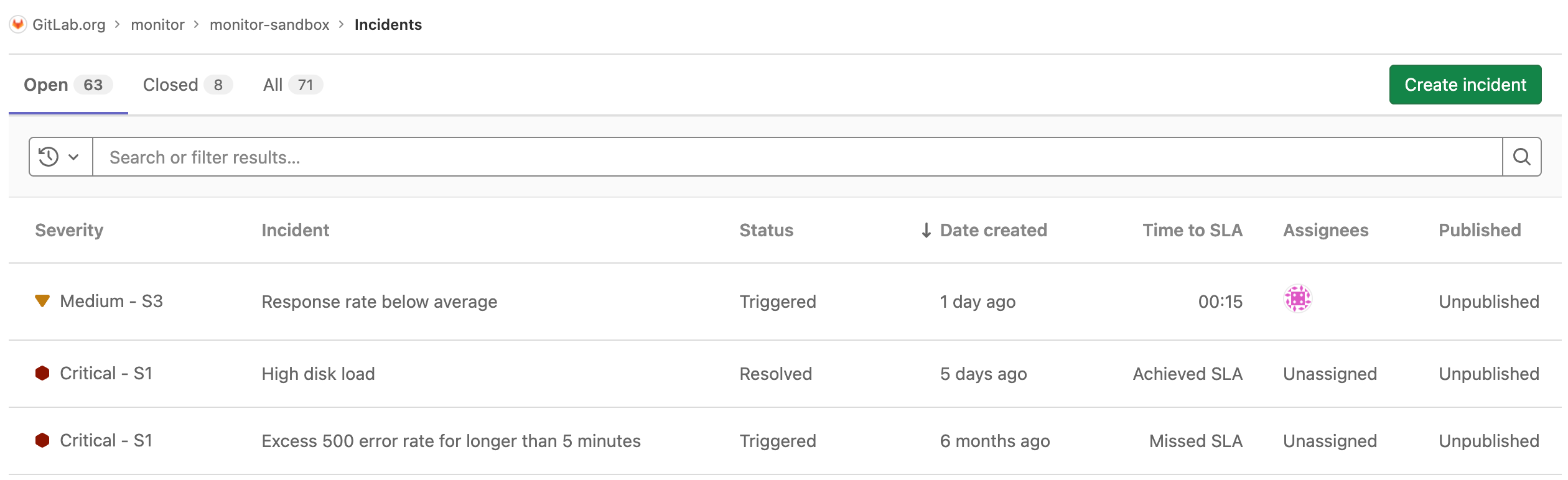 For users with at least Guest permissions, the Incident list is available at Monitor > Incidents in your project's sidebar. The list contains the following metrics: