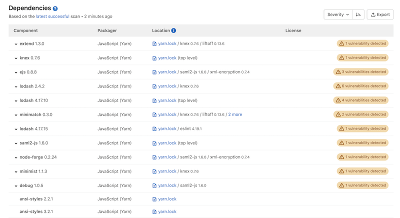 You can download your project's list of dependencies and their details in JSON format by selecting the Export button. Note that the dependency list only shows the results of the last successful pipeline to run on the default branch.