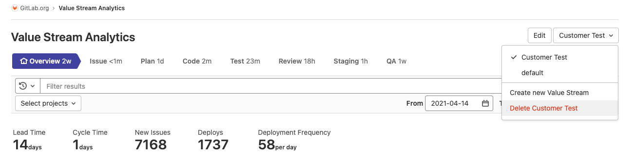 Once created, a new value stream includes the stages that follow GitLab workflow best practices. You can customize this flow by adding, hiding or re-ordering stages.