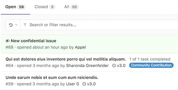 There are a few things that visually separate a confidential issue from a regular one. In the issues index page view, you can see the eye-slash ({eye-slash}) icon next to the issues that are marked as confidential: