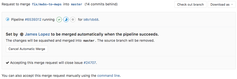 When reviewing a merge request that looks ready to merge but still has a pipeline running, you can set it to merge automatically when the pipeline succeeds. This way, you don't have to wait for the pipeline to finish and remember to merge the request manually.