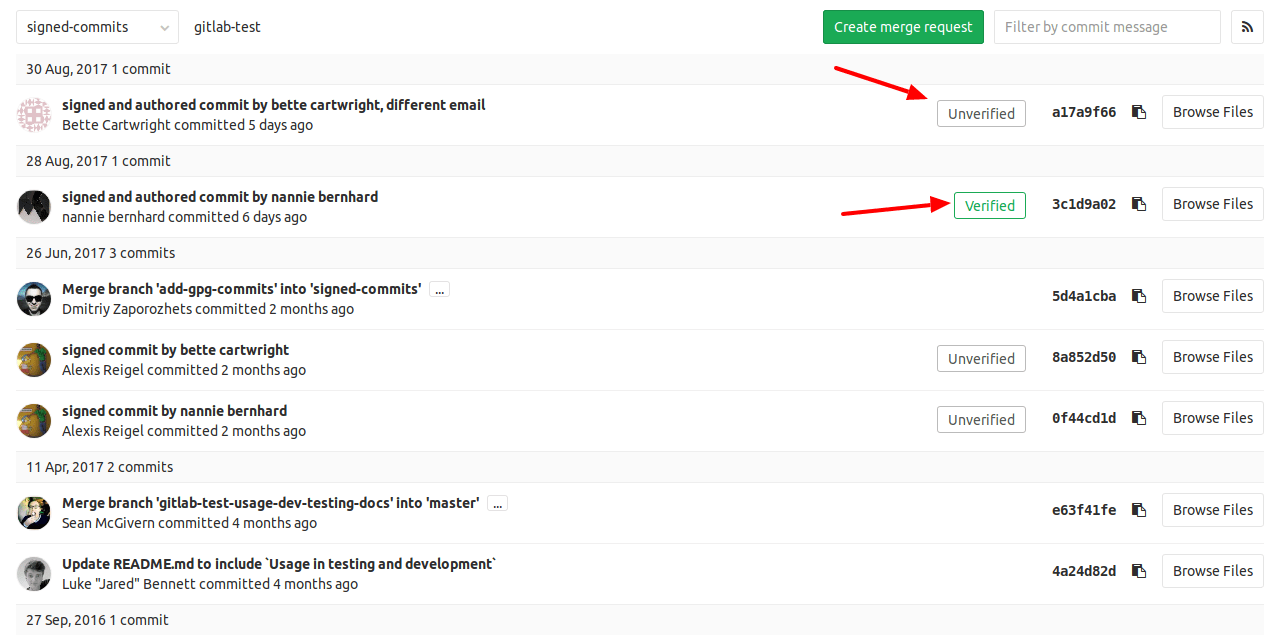 You can sign the commits you make in a GitLab repository with a GPG (GNU Privacy Guard) key. When you add a cryptographic signature to your commit, you provide extra assurance that a commit originated from you, rather than an impersonator. If GitLab can verify a commit author's identity with a public GPG key, the commit is marked Verified in the GitLab UI. You can then configure push rules for your project to reject individual commits not signed with GPG, or reject all commits from unverified users.